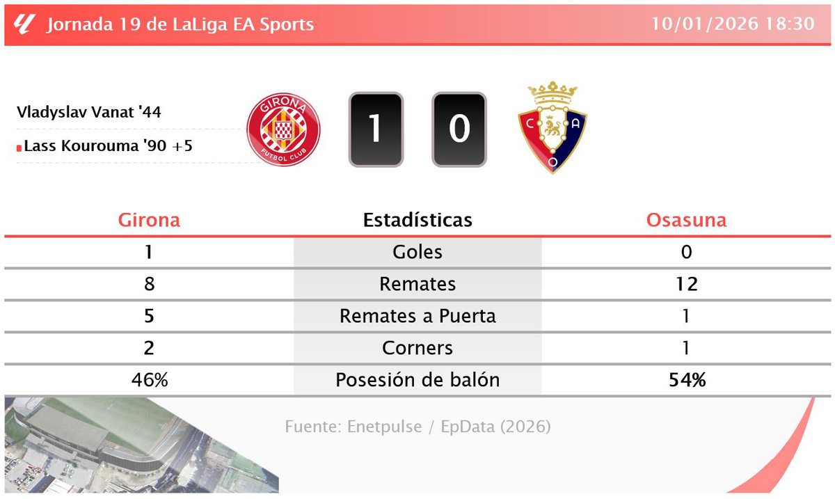 Girona 1 - 0 Osasuna: resumen y estadísticas del partido de la jornada 19 de LaLiga EA Sports - EUROPA PRESS (2026)