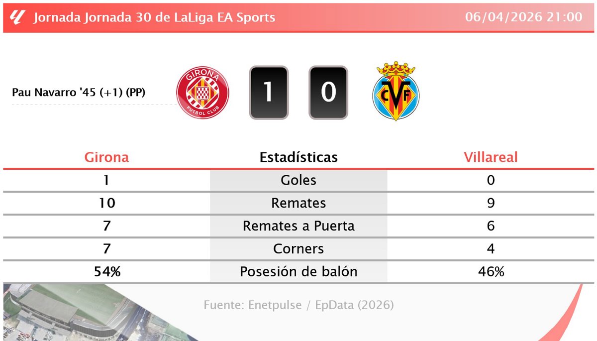 Girona 1 - 0 Villareal: resumen y estadísticas del partido de la jornada 30 de LaLiga EA Sports - EUROPA PRESS (2026)