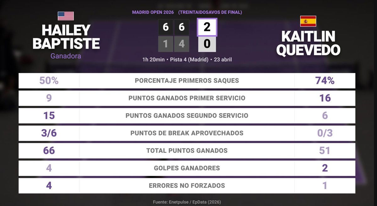 Hailey Baptiste 2 - 0 Kaitlin Quevedo: resumen y estadísticas del partido de Madrid Open (WTA) - EUROPA PRESS (2026)