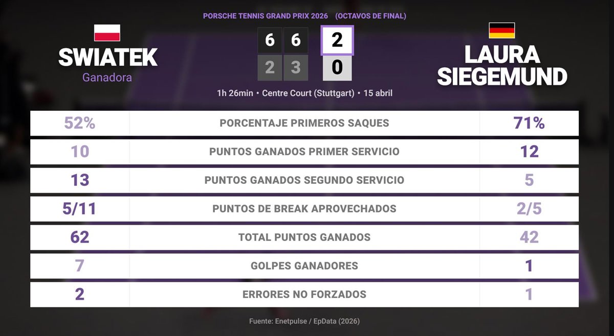 Iga Swiatek 2 - 0 Laura Siegemund: resumen y estadísticas del partido de Porsche Tennis Grand Prix (WTA) - EUROPA PRESS (2026)