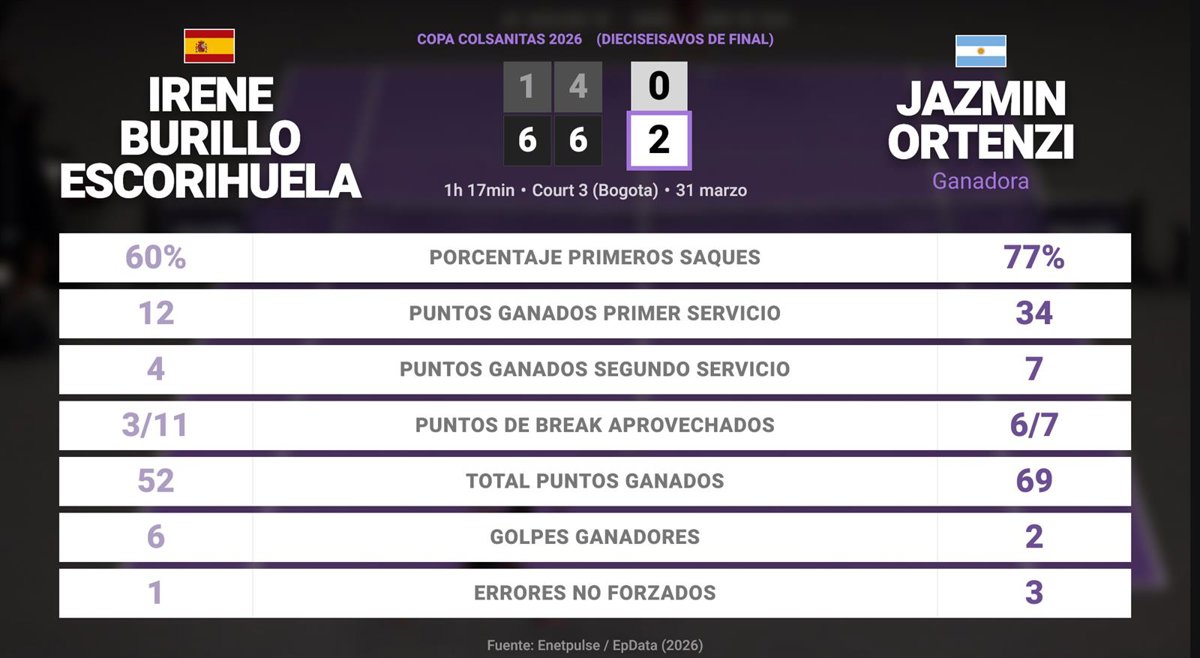 Irene Burillo Escorihuela 0 - 2 Jazmin Ortenzi: resumen y estadísticas del partido de Copa Colsanitas (WTA) - EUROPA PRESS (2026)