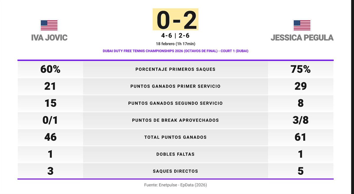 Iva Jovic 0 - 2 Jessica Pegula: resumen y estadísticas del partido de Dubai Duty Free Tennis Championships (WTA) - EUROPA PRESS (2026)