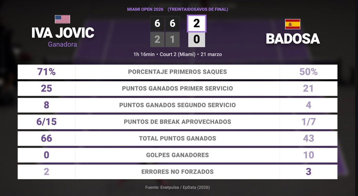Iva Jovic 2 - 0 Paula Badosa: resumen y estadísticas del partido de Miami Open (WTA) - EUROPA PRESS (2026)