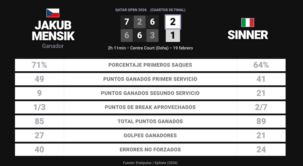 Jakub Mensik 2 - 1 Jannik Sinner: resumen y estadísticas del partido de Qatar Open (ATP) - EUROPA PRESS (2026)