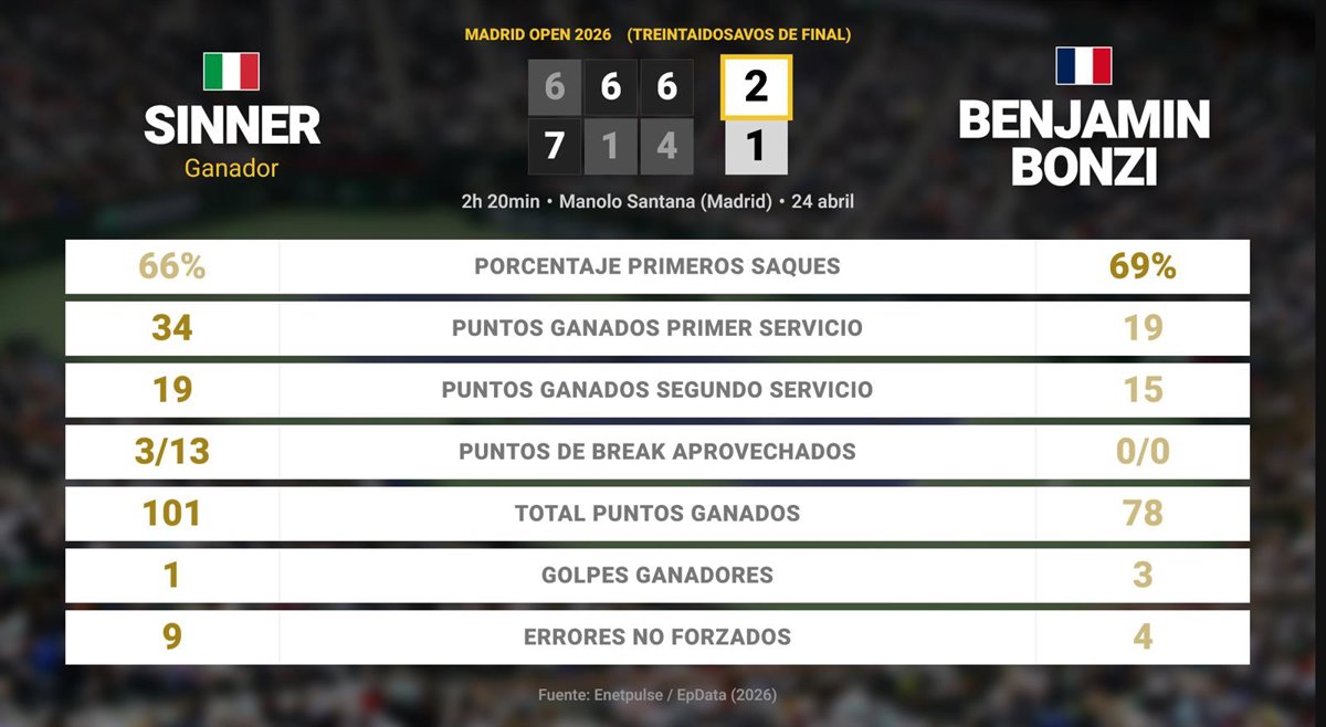 Jannik Sinner 2 - 1 Benjamin Bonzi: resumen y estadísticas del partido de Madrid Open (ATP) - EUROPA PRESS (2026)