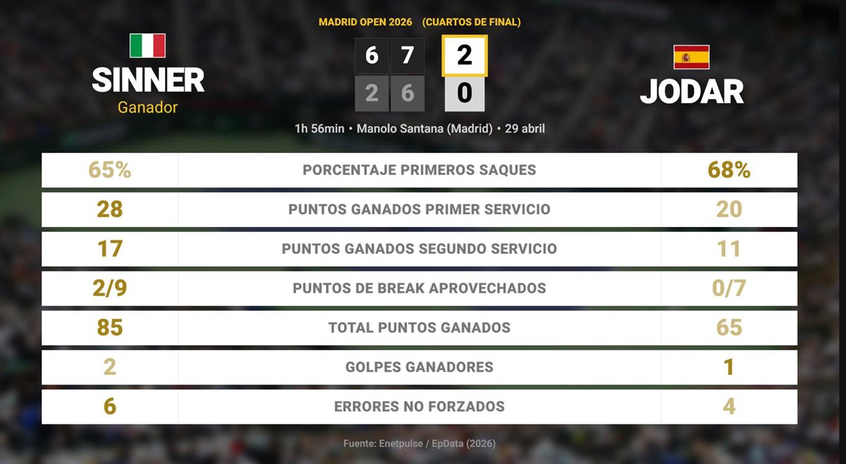 Jannik Sinner 2 - 0 Rafael Jodar: resumen y estadísticas del partido de Madrid Open (ATP) - EUROPA PRESS (2026)