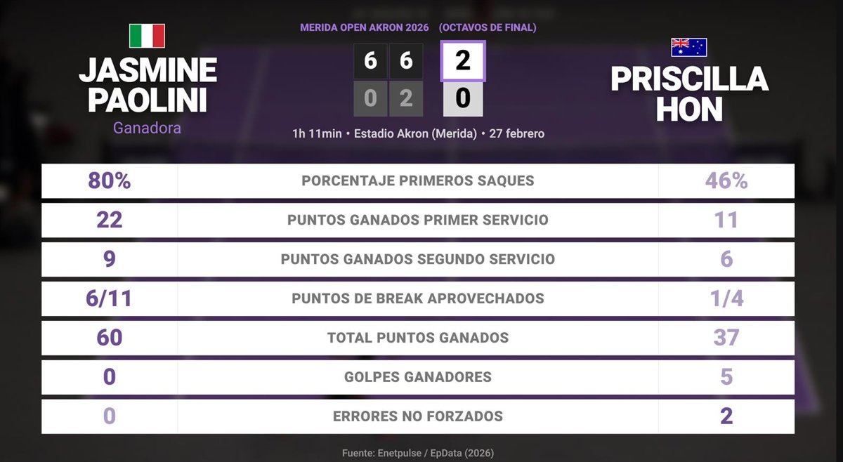 Jasmine Paolini 2 - 0 Priscilla Hon: resumen y estadísticas del partido de Merida Open Akron (WTA) - EUROPA PRESS (2026)