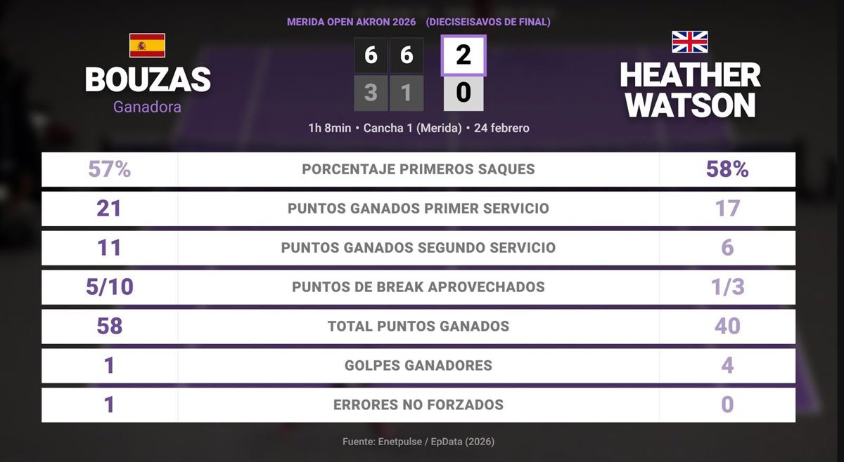 Jessica Bouzas Maneiro 2 - 0 Heather Watson: resumen y estadísticas del partido de Merida Open Akron (WTA) - EUROPA PRESS (2026)