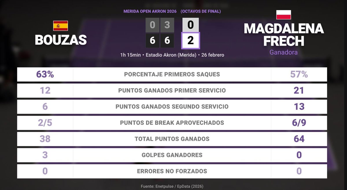Jessica Bouzas Maneiro 0 - 2 Magdalena Frech: resumen y estadísticas del partido de Merida Open Akron (WTA) - EUROPA PRESS (2026)