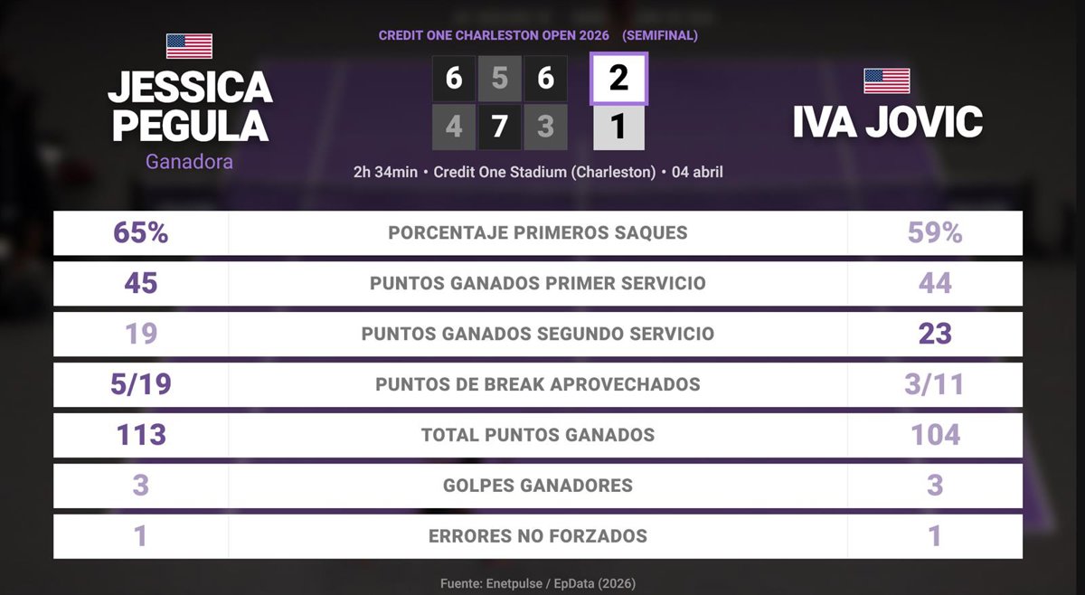 Jessica Pegula 2 - 1 Iva Jovic: resumen y estadísticas del partido de Credit One Charleston Open (WTA) - EUROPA PRESS (2026)