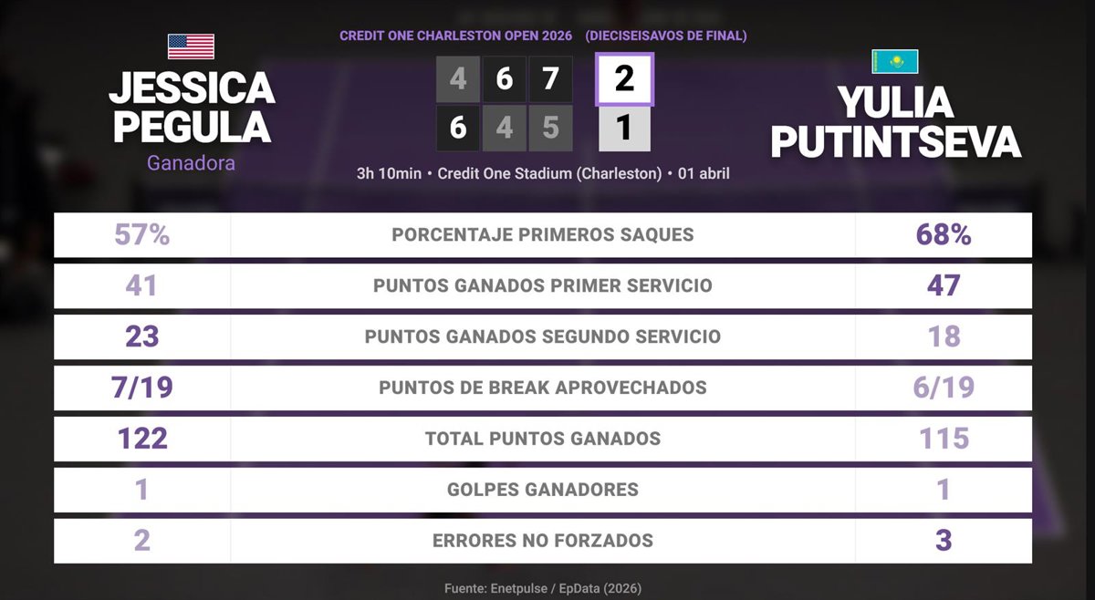 Jessica Pegula 2 - 1 Yulia Putintseva: resumen y estadísticas del partido de Credit One Charleston Open (WTA) - EUROPA PRESS (2026)