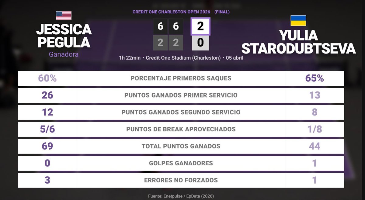 Jessica Pegula 2 - 0 Yulia Starodubtseva: resumen y estadísticas del partido de Credit One Charleston Open (WTA) - EUROPA PRESS (2026)