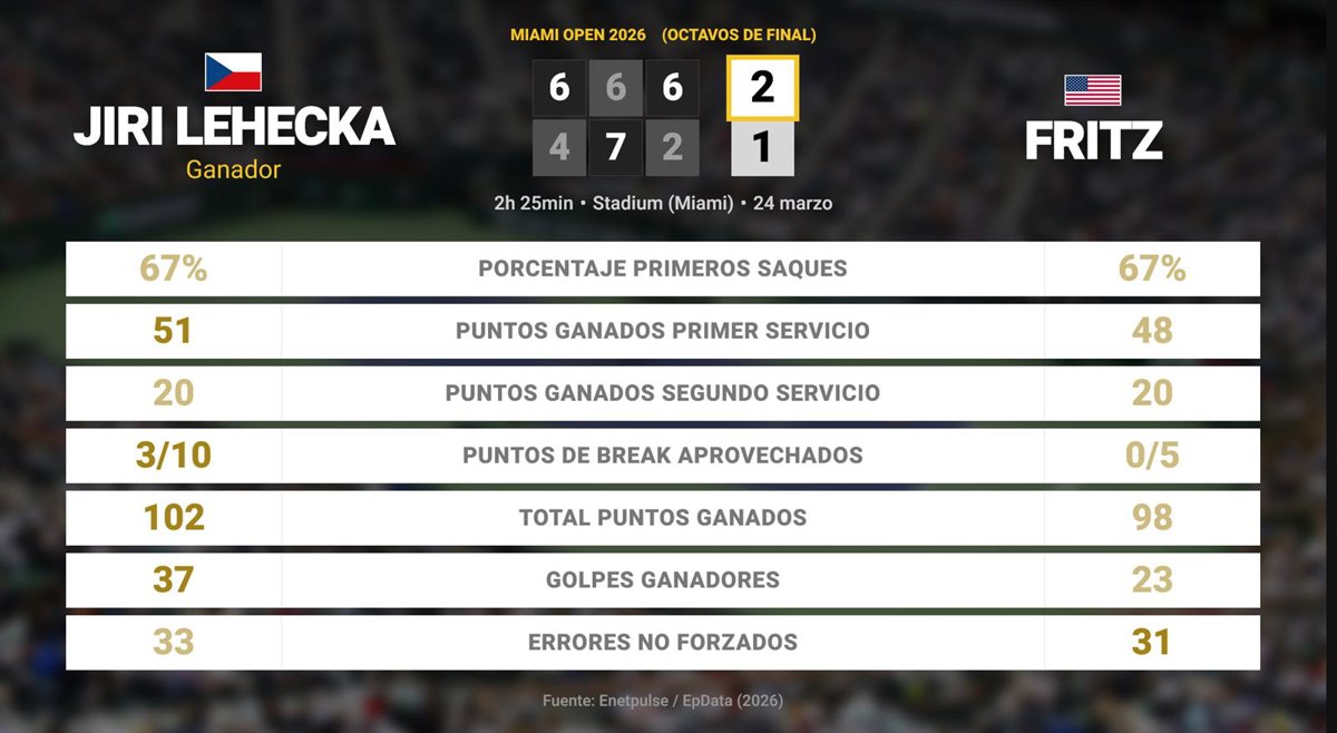 Jiri Lehecka 2 - 1 Taylor Fritz: resumen y estadísticas del partido de Miami Open (ATP) - EUROPA PRESS (2026)