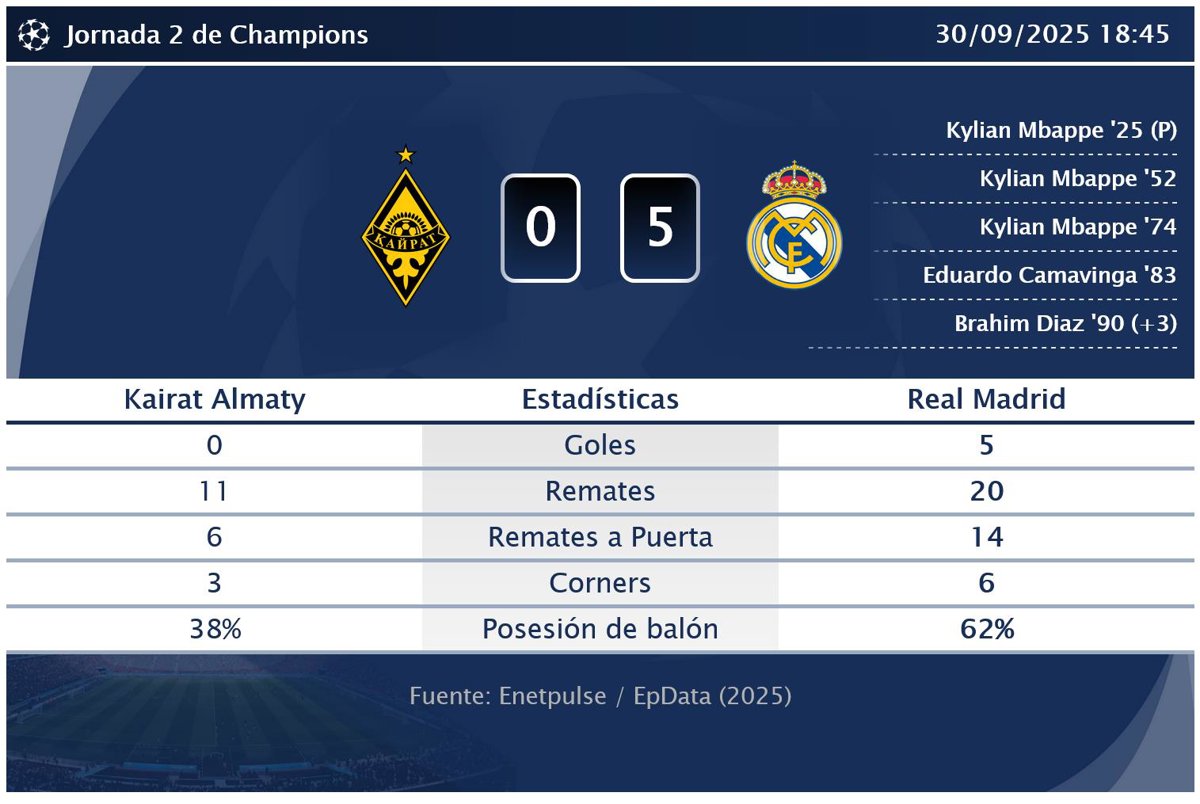 Kairat Almaty 0 - 5 Real Madrid: resumen y estadísticas del partido de la jornada 2 de Champions - EUROPA PRESS (2025)