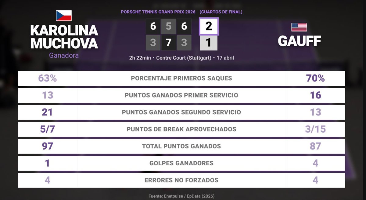 Karolina Muchova 2 - 1 Coco Gauff: resumen y estadísticas del partido de Porsche Tennis Grand Prix (WTA) - EUROPA PRESS (2026)