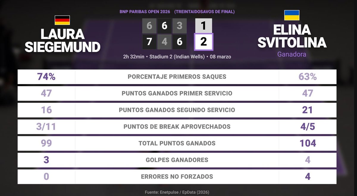 Laura Siegemund 1 - 2 Elina Svitolina: resumen y estadísticas del partido de BNP Paribas Open (WTA) - EUROPA PRESS (2026)