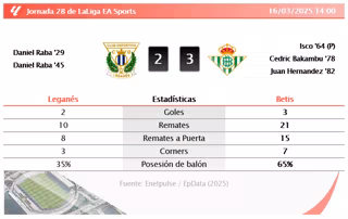 El Betis se impuso este domingo en el Estadio Butarque por 2-3 en un partido vibrante, remontando un 2-0 inicial del Leganés. Daniel Raba fue el protagonista de la primera parte con dos goles (minutos 29 y 45), pero en la segunda mitad el conjunto verdiblanco dio la vuelta al marcador con tantos de Isco de penalti, Cedric Bakambu y Juan Hernandez. El equipo visitante dominó claramente el encuentro con un 65% de posesión y 21 remates por los 10 del Leganés, siendo Isco el jugador más participativo en ataque.