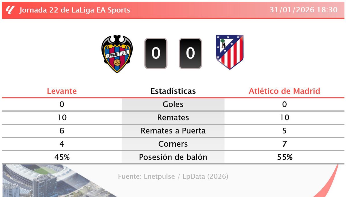 Levante 0 - 0 Atlético de Madrid: resumen y estadísticas del partido de la jornada 22 de LaLiga EA Sports - EUROPA PRESS (2026)