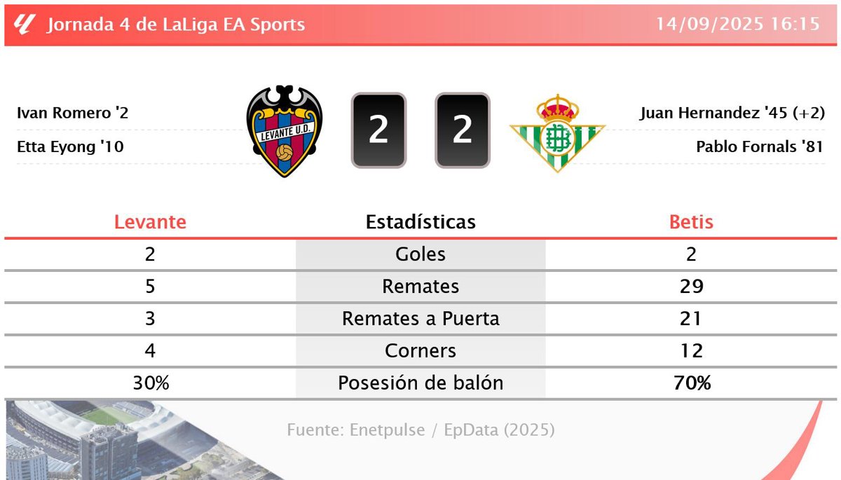 Levante 2 - 2 Betis: resumen y estadísticas del partido de la jornada 4 de LaLiga EA Sports - EUROPA PRESS (2025)