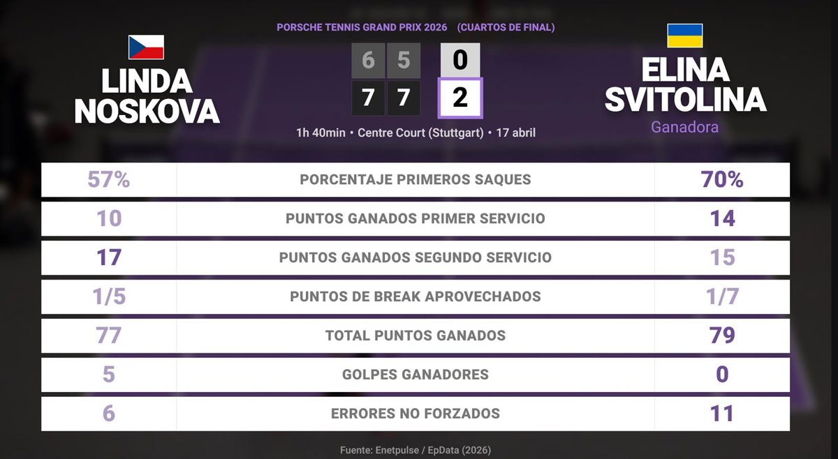 Linda Noskova 0 - 2 Elina Svitolina: resumen y estadísticas del partido de Porsche Tennis Grand Prix (WTA) - EUROPA PRESS (2026)
