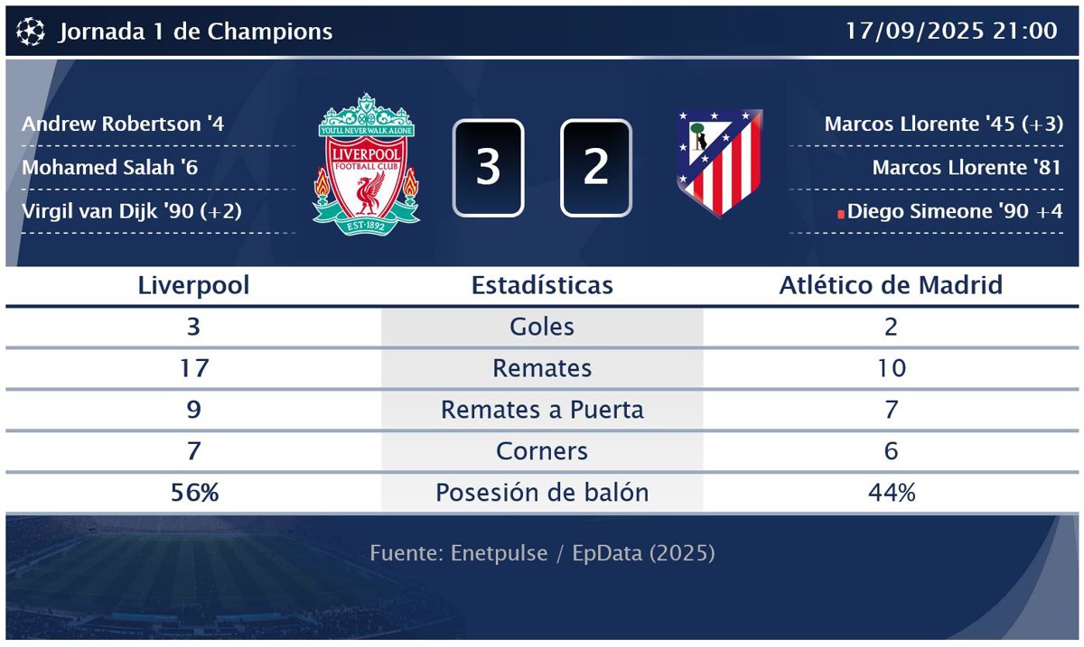 | 17/09/2025 | Champions | Liverpool | 3-2 | Atlético |