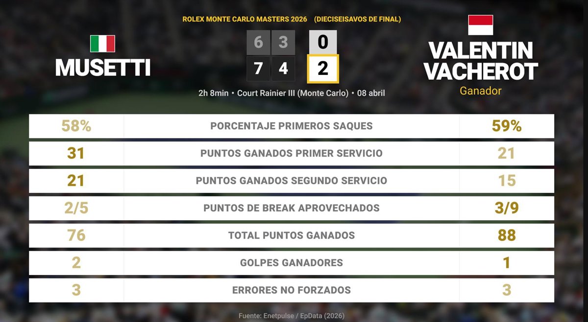 Lorenzo Musetti 0 - 2 Valentin Vacherot: resumen y estadísticas del partido de Rolex Monte Carlo Masters (ATP) - EUROPA PRESS (2026)