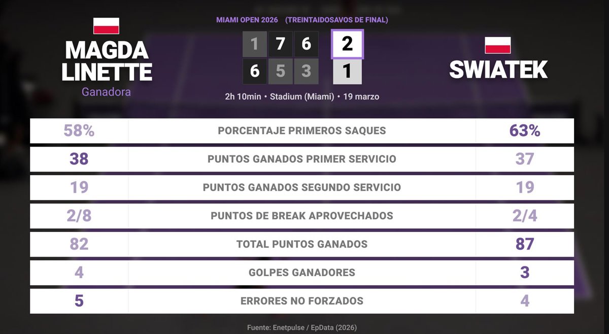 Magda Linette 2 - 1 Iga Swiatek: resumen y estadísticas del partido de Miami Open (WTA) - EUROPA PRESS (2026)