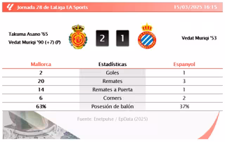 En un emocionante encuentro en el Estadi Mallorca Son Moix, el Mallorca se impuso por 2-1 al Espanyol, con una notable actuación que les permitió llevarse los tres puntos en esta jornada. El partido estuvo marcado por la intensa actividad ofensiva del Mallorca, que dominó la posesión del balón con un 63% y realizó un total de 20 remates, frente a los 3 del Espanyol, evidenciando su superioridad en el campo. Takuma Asano y Vedat Muriqi fueron claves en el ataque, con Muriqi convirtiendo un penal decisivo en el tiempo añadido, tras una revisión del VAR que confirmó la falta dentro del área.