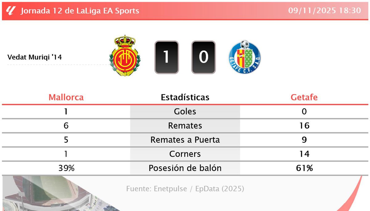 El Mallorca ha ganado este domingo por 1-0 al Getafe en el primer partido de la jornada 12 de LaLiga EA Sports. El único gol del encuentro lo marcó Vedat Muriqi a los 14 minutos, tras una asistencia de Johan Mojica. El conjunto local llevó la iniciativa del partido, con más remates y posesión de balón, siendo Muriqi el jugador más participativo en ataque.