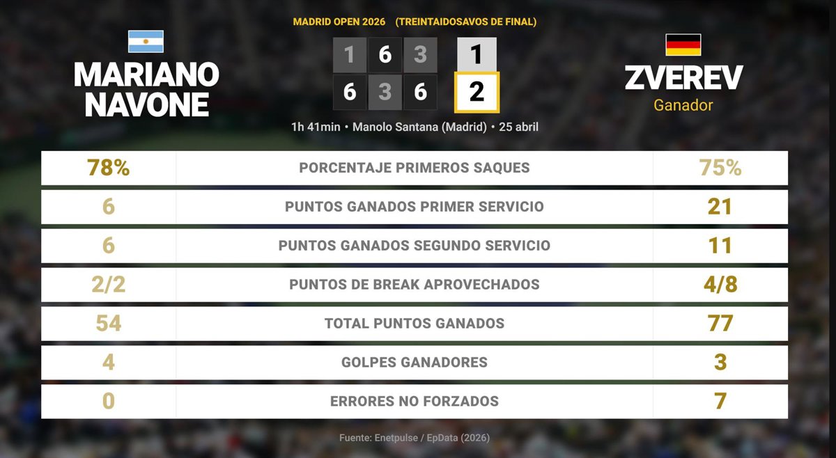 Mariano Navone 1 - 2 Alexander Zverev: resumen y estadísticas del partido de Madrid Open (ATP) - EUROPA PRESS (2026)