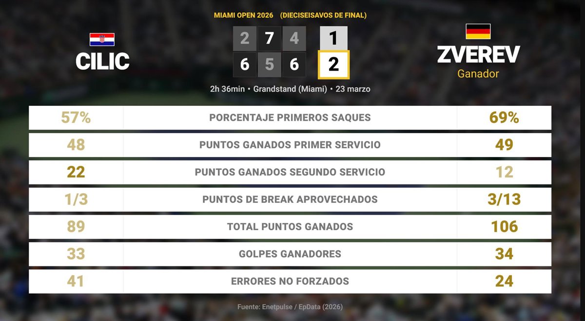 Marin Cilic 1 - 2 Alexander Zverev: resumen y estadísticas del partido de Miami Open (ATP) - EUROPA PRESS (2026)
