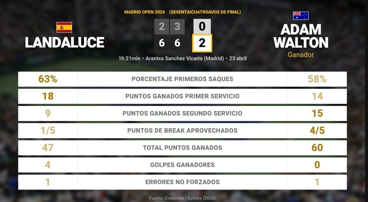 Martin Landaluce 0 - 2 Adam Walton: resumen y estadísticas del partido de Madrid Open (ATP) - EUROPA PRESS (2026)