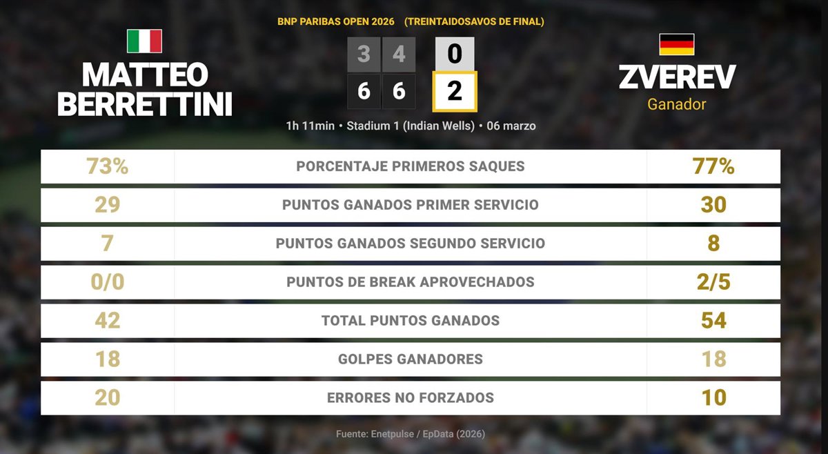 Matteo Berrettini 0 - 2 Alexander Zverev: resumen y estadísticas del partido de BNP Paribas Open (ATP) - EUROPA PRESS (2026)