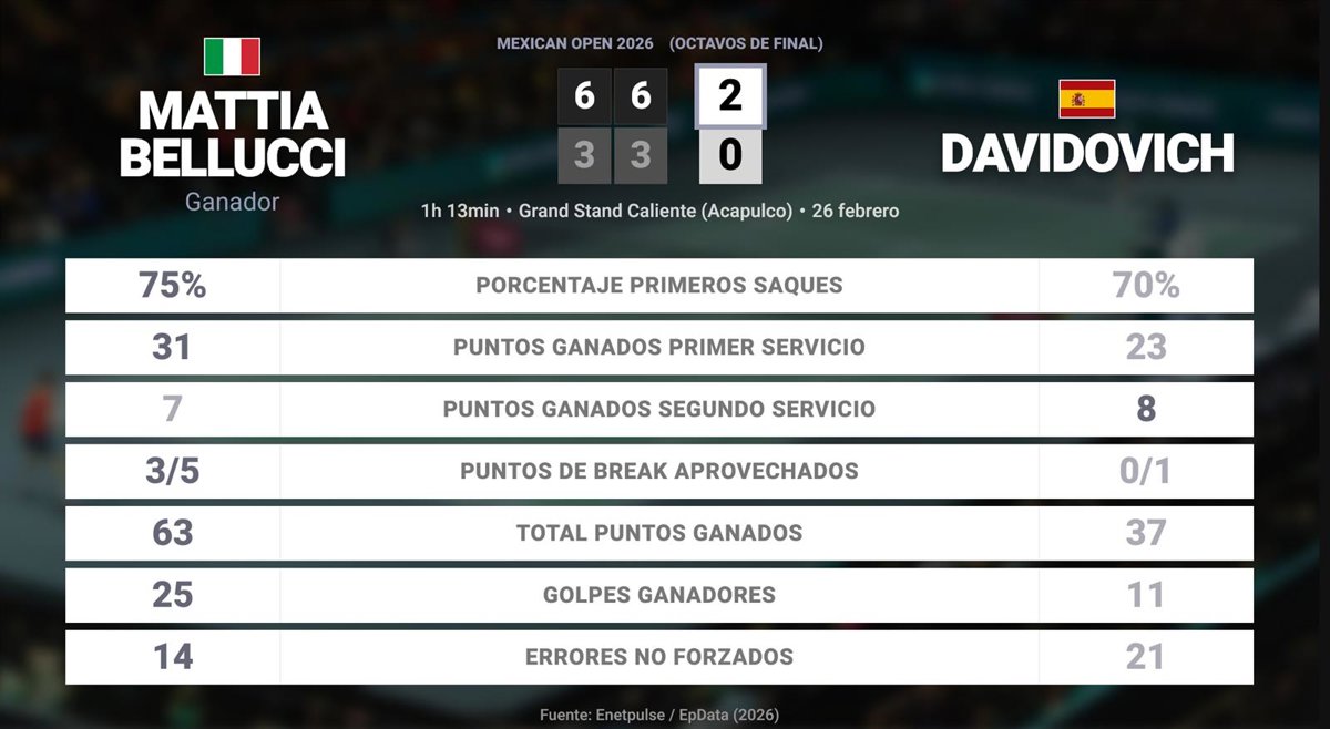 Mattia Bellucci 2 - 0 Alejandro Davidovich Fokina: resumen y estadísticas del partido de Mexican Open (ATP) - EUROPA PRESS (2026)