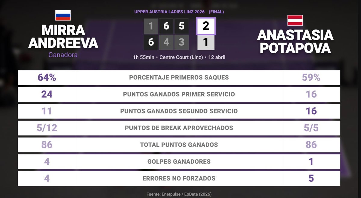 Mirra Andreeva 2 - 1 Anastasia Potapova: resumen y estadísticas del partido de Upper Austria Ladies Linz (WTA) - EUROPA PRESS (2026)