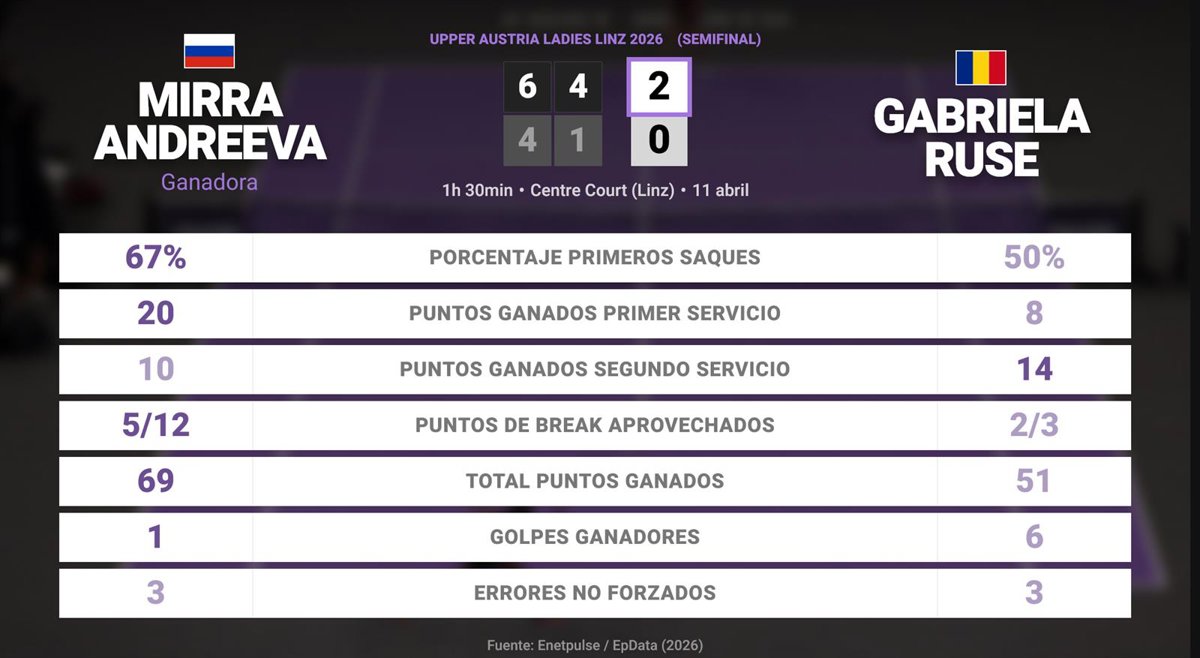 Mirra Andreeva 2 - 0 Gabriela Ruse: resumen y estadísticas del partido de Upper Austria Ladies Linz (WTA) - EUROPA PRESS (2026)