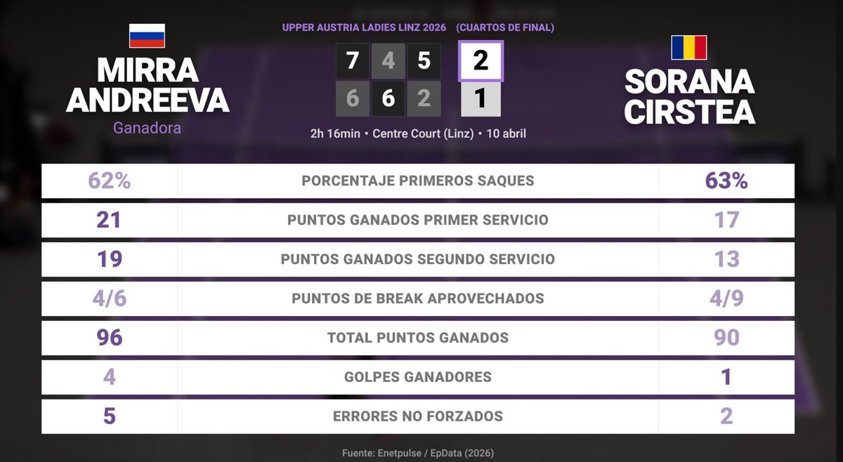 Mirra Andreeva 2 - 1 Sorana Cirstea: resumen y estadísticas del partido de Upper Austria Ladies Linz (WTA) - EUROPA PRESS (2026)