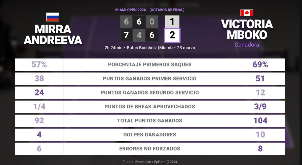 Mirra Andreeva 1 - 2 Victoria Mboko: resumen y estadísticas del partido de Miami Open (WTA) - EUROPA PRESS (2026)