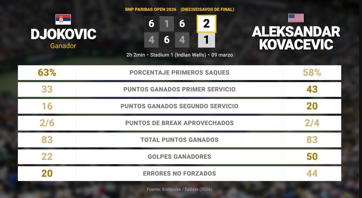 Novak Djokovic 2 - 1 Aleksandar Kovacevic: resumen y estadísticas del partido de BNP Paribas Open (ATP) - EUROPA PRESS (2026)