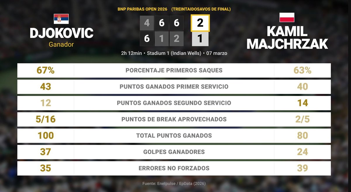 Novak Djokovic 2 - 1 Kamil Majchrzak: resumen y estadísticas del partido de BNP Paribas Open (ATP) - EUROPA PRESS (2026)