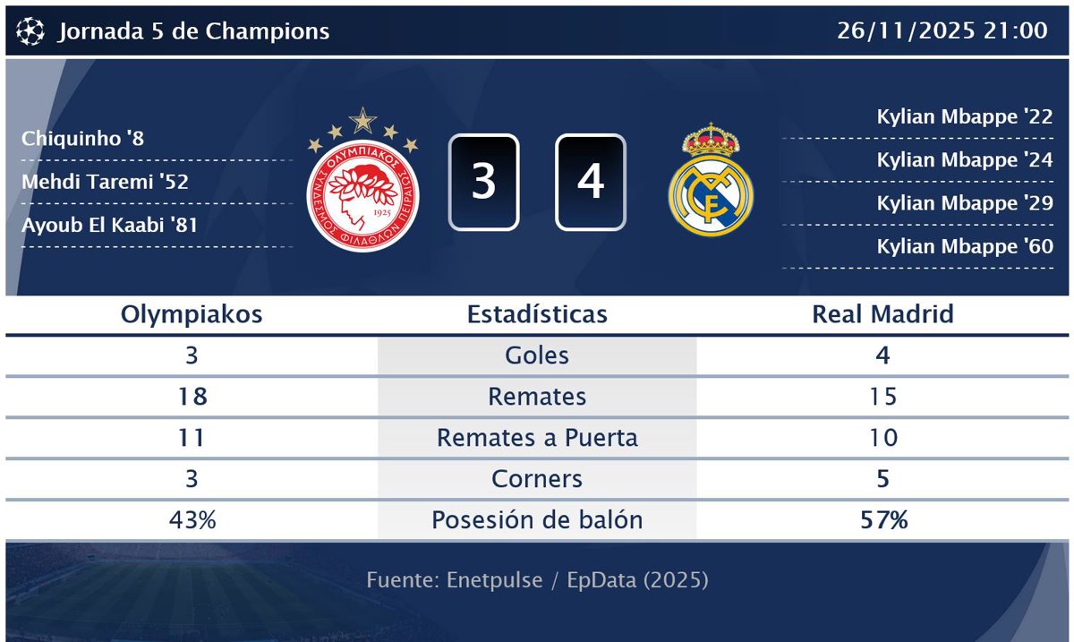 Olympiakos 3 - 4 Real Madrid: resumen y estadísticas del partido de la jornada 5 de Champions - EUROPA PRESS (2025)