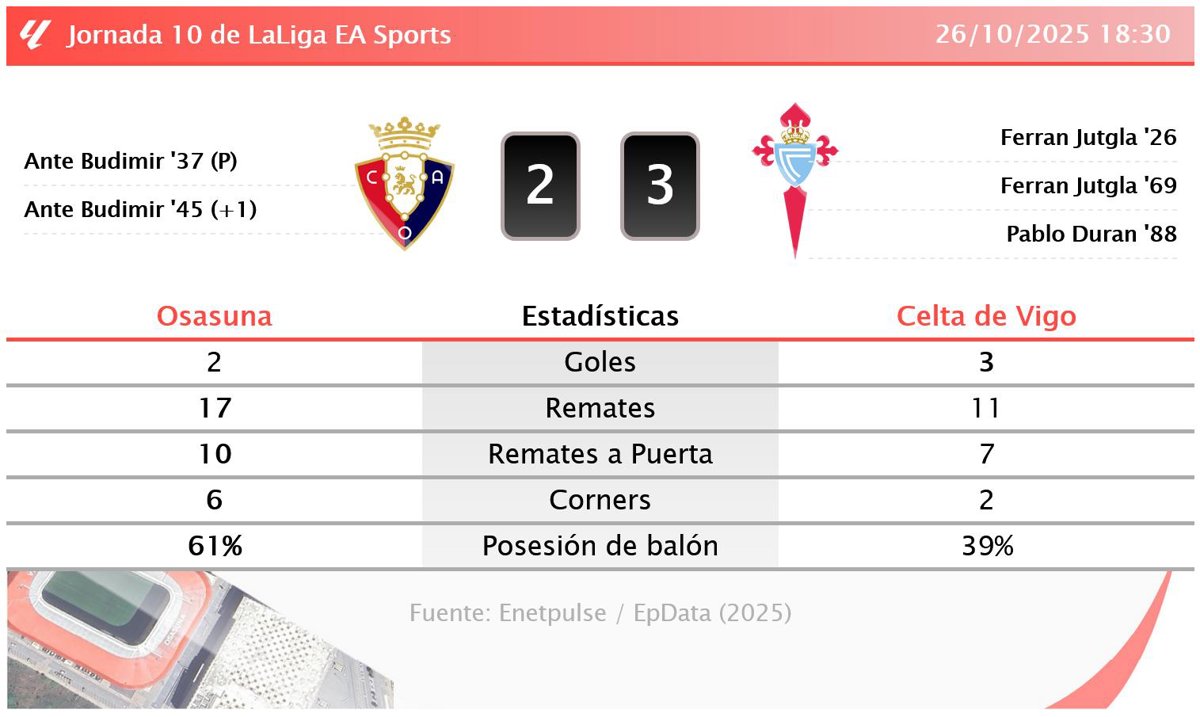 El Celta de Vigo ha ganado este domingo (10/26/2025 6:30:00 PM) por 3-2 al Osasuna en el primer partido de la jornada 10 en LaLiga EA Sports, aprovechando los celestes en la segunda mitad la fragilidad defensiva de su adversario, que sigue en puestos de descenso y dejando muy malas sensaciones. Los goleadores fueron Ferran Jutgla (min.26 y 69) y Pablo Duran (min.88) por el Celta de Vigo, mientras que Ante Budimir (min.37 y 45+1) marcó los tantos del Osasuna. Cabe destacar que Ante Budimir falló un penalti en el minuto 79.