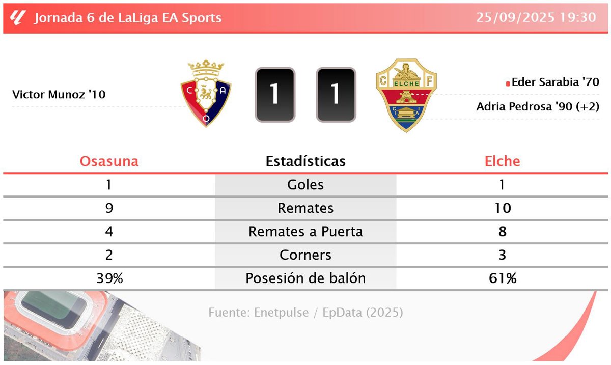 Osasuna 1 - 1 Elche: resumen y estadísticas del partido de la jornada 6 de LaLiga EA Sports - EUROPA PRESS (2025)