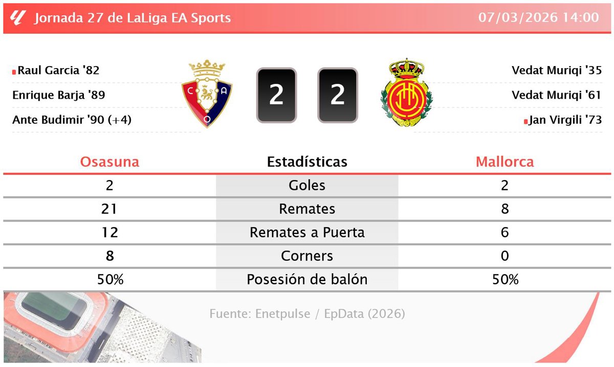 Osasuna 2 - 2 Mallorca: resumen y estadísticas del partido de la jornada 27 de LaLiga EA Sports - EUROPA PRESS (2026)