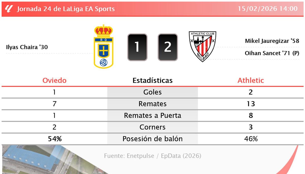 Oviedo 1 - 2 Athletic: resumen y estadísticas del partido de la jornada 24 de LaLiga EA Sports - EUROPA PRESS (2026)