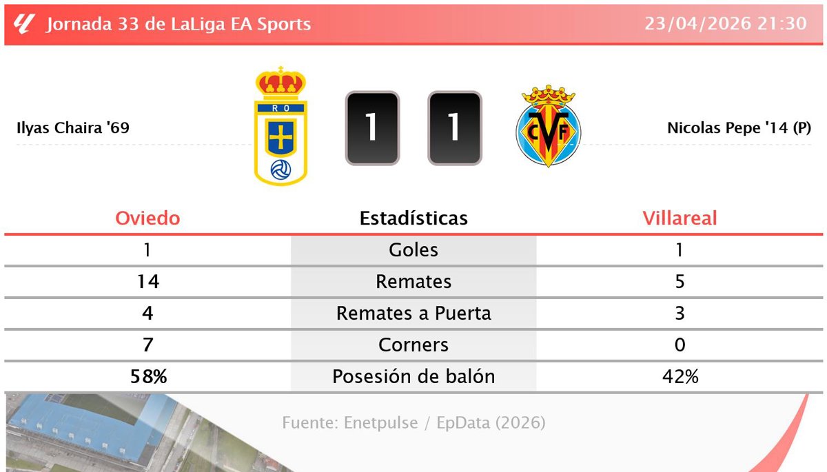 | 23/04/2026 | LaLiga | Real Oviedo | 1-1 | Villarreal |