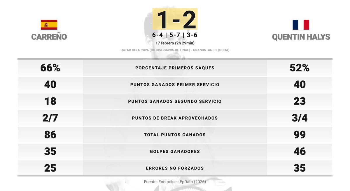 Pablo Carreno Busta 1 - 2 Quentin Halys: resumen y estadísticas del partido de Qatar Open (ATP) - EUROPA PRESS (2026)