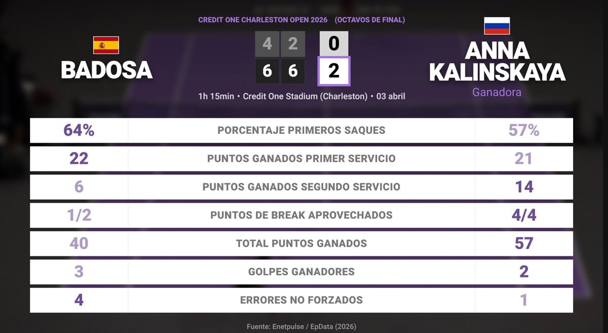 Paula Badosa 0 - 2 Anna Kalinskaya: resumen y estadísticas del partido de Credit One Charleston Open (WTA) - EUROPA PRESS (2026)