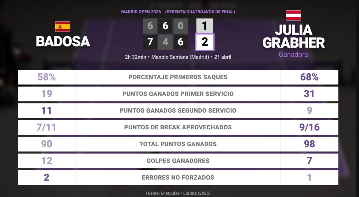 Paula Badosa 1 - 2 Julia Grabher: resumen y estadísticas del partido de Madrid Open (WTA) - EUROPA PRESS (2026)