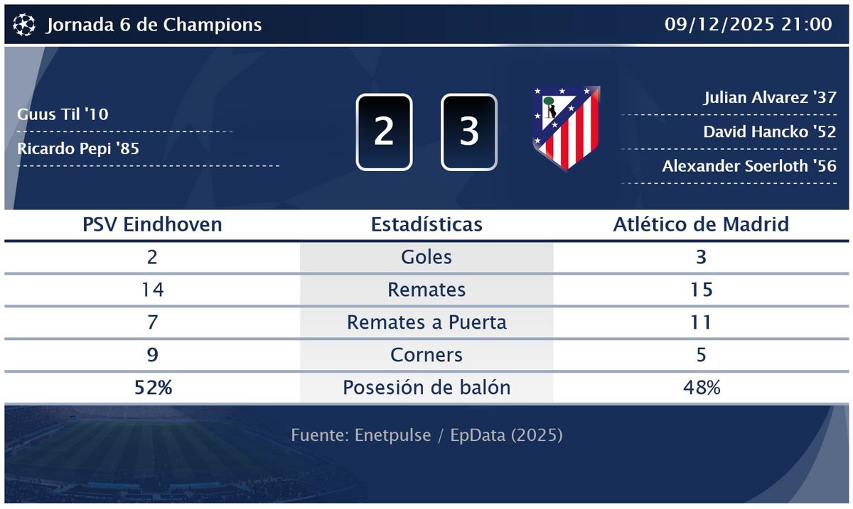 PSV Eindhoven 2 - 3 Atlético de Madrid: resumen y estadísticas del partido de la jornada 6 de Champions - EUROPA PRESS (2025)
